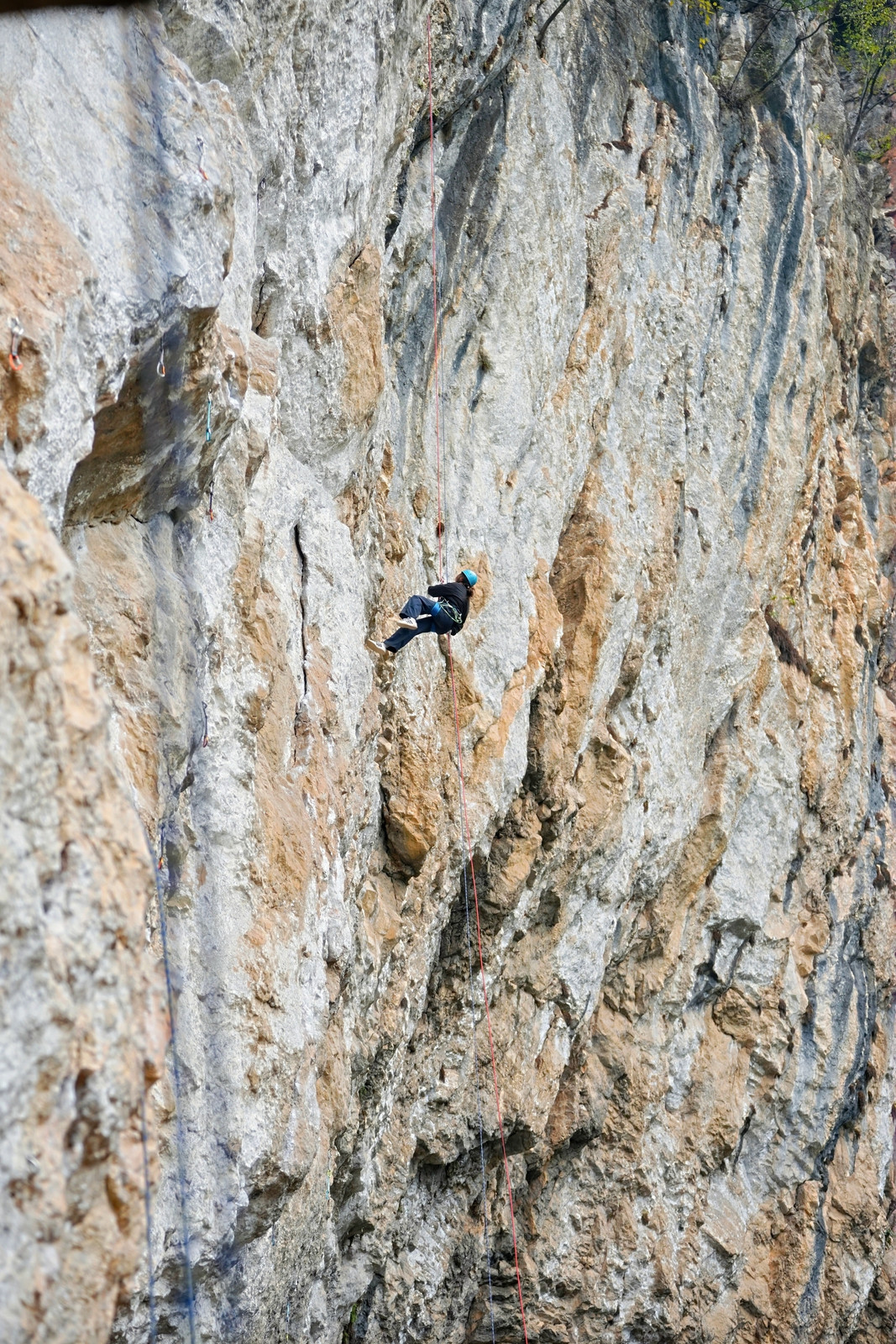 前置教育结束后,正式教学环节有序展开。张俊老师聚焦自然岩壁攀爬技能,详细讲解动作要领与注意事项,随后带领同学们逐一尝试攀爬,通过现场示范与实时指导,帮助大家掌握发力技巧与路线规划方法。与此同时,王玉锋老师针对高空岩降模块开展教学,从装备佩戴、绳结打法到下降速度控制,逐项拆解操作步骤,并全程做好安全保护,引导同学们克服高空恐惧,顺利完成岩降实践。
