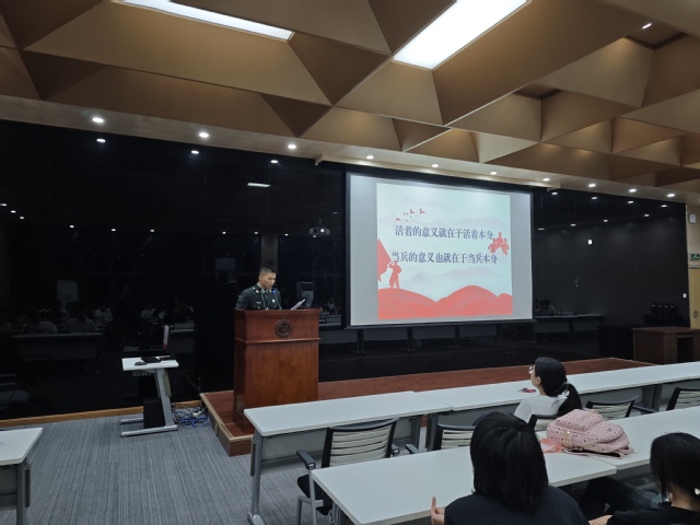 随后,曾驻守边疆的吴雨泽分享了在艰苦环境下守护祖国边疆的点点滴滴——零下几十度的酷寒、一望无际的戈壁、与战友并肩作战的日日夜夜,每一个细节都让在场的新生为之动容。“‘当兵后悔两年,不当兵后悔一辈子’,这句话我如今有了深切地体会。”吴雨泽动情地说道,军旅生涯磨砺了他的身心和意志,让他学会了坚韧、团结与奉献。他希望同学们能抓住机会,到部队这个大熔炉里锻炼自己,用青春守护祖国的万家灯火。